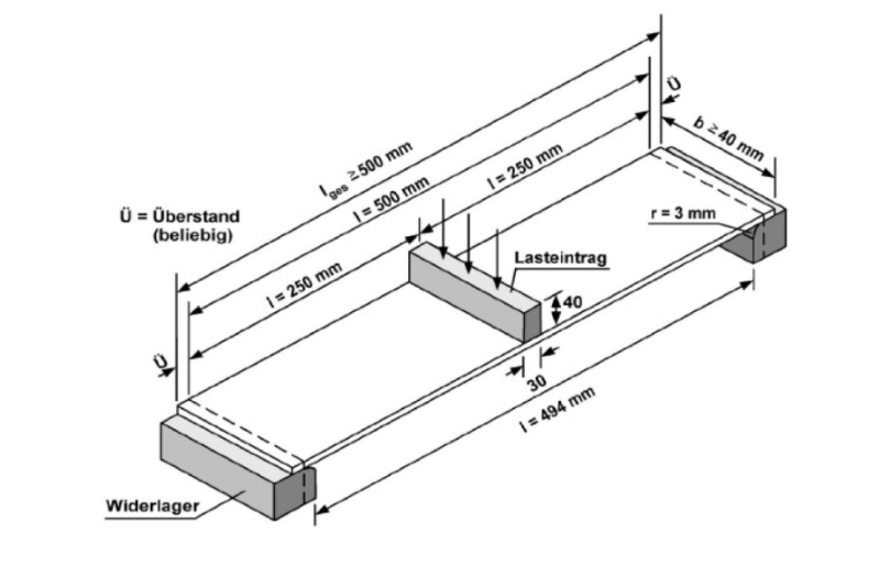 - Der Lasteintrag erfolgt über einen 30mm breiten und 40mm hohen quaderförmigen Holzklotz. Die Länge des Holzklotzes wird der jeweiligen Fahrbahn angepasst